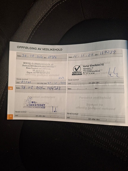 Servicehistorikk – 28.02.2025 – 144 523 km – 14.11.2024 – 139 289 km – 23.08.2023 – 117 956 km – 09.11.2021 – 84 706 km – 30.10.2020 – 61 986 km – 15.10.2019 – 43 877 km – 19.10.2018 – 29 090 km – 02.10.2017 – 15 554 km